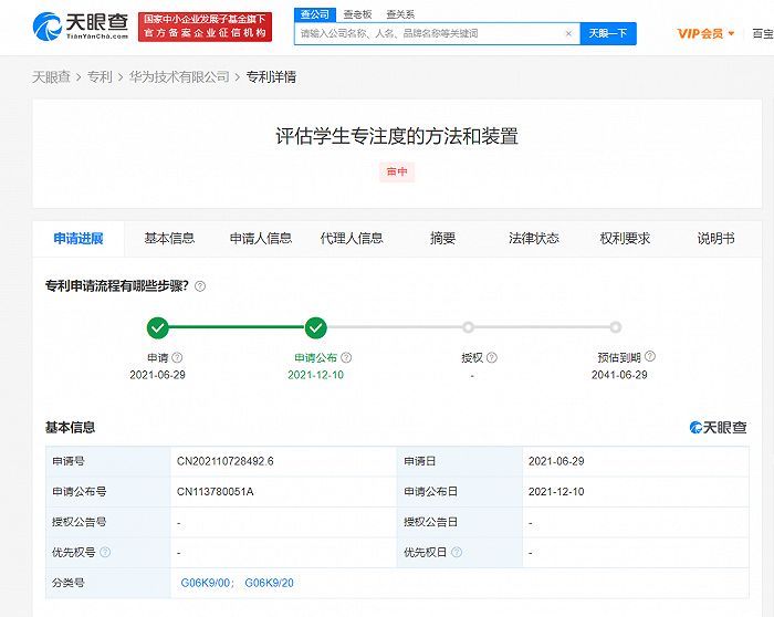 天眼查App显示,12月10日,华为技术有限公司公开“评估学生专注度的方法和装置”专利。