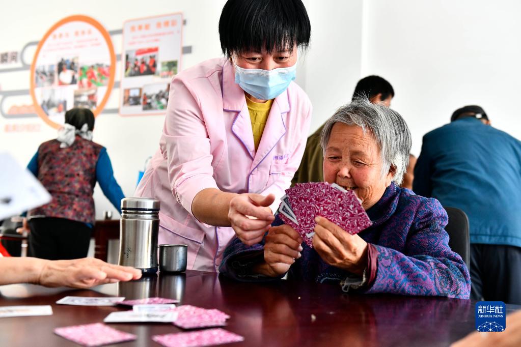 在山东省东营市垦利区杨庙社区养老服务中心,工作人员陪老人打扑克(10月18日摄)。