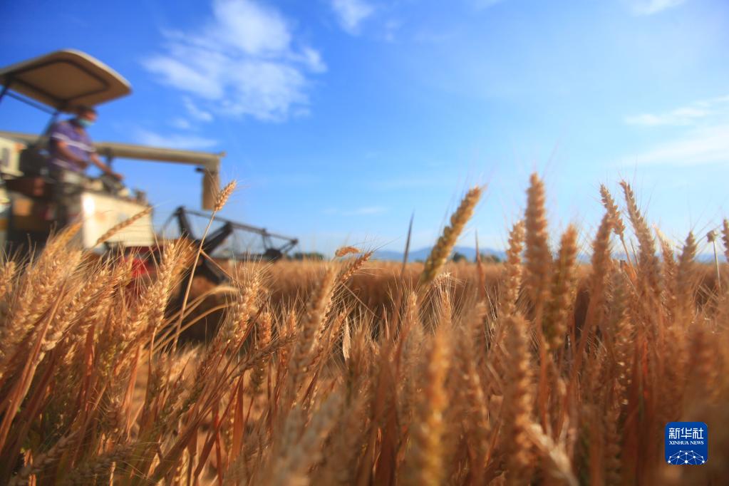 收割机在山东省临沂市平邑县的麦田里收割小麦(6月8日摄)。